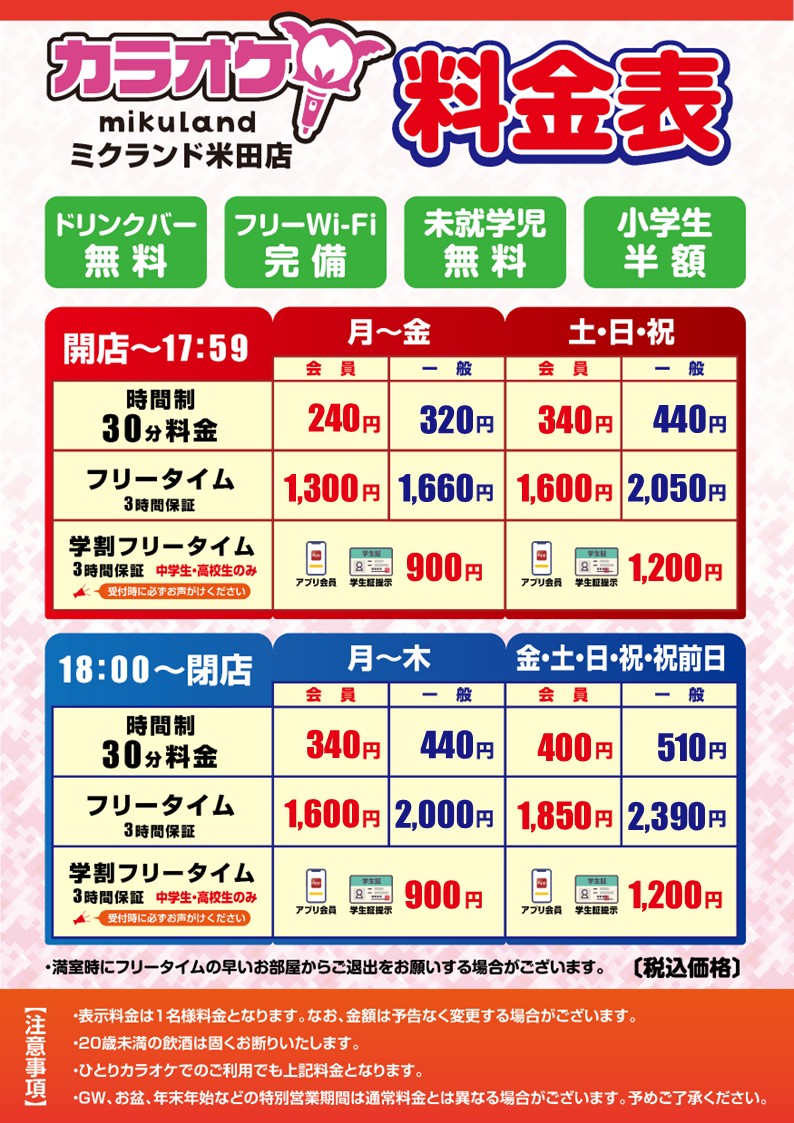 ※夏休み期間やお盆・GW、年末年始などはハイシーズン料金になり、通常の料金とは異なります。詳しくは店内料金表をご確認ください。